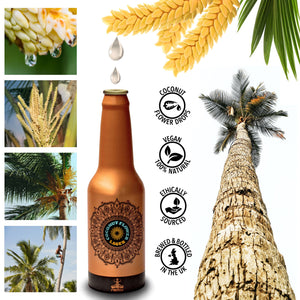 Coconut Flower Drops are obtained by tapping the inflorescence of the coconut palm before sunrise. This highly intricate work can only be done by highly skilled farmers. The Coconut Flower Drops are collected in a chilled container, where the container is fastened to the inflorescence stump or spathe. It is important for the Coconut Flower Drops to be sustained in an end-to-end cold chain, to maintain their purity. Interestingly, Coconut Flower Drops have the innate talent of attracting live cultures (yeast and bacteria) that provide health benefits. This also means they are likely to start fermenting naturally in a high temperature climate without human intervention. In other words, Coconut Flower Drops have the inborn skill of naturally transforming from unfermented Coconut Flower Drops to a fermented Coconut Flower Wine, and finally to a fermented Coconut Flower Vinegar. Thanks to Mother Nature for this amazing gift in three variations!